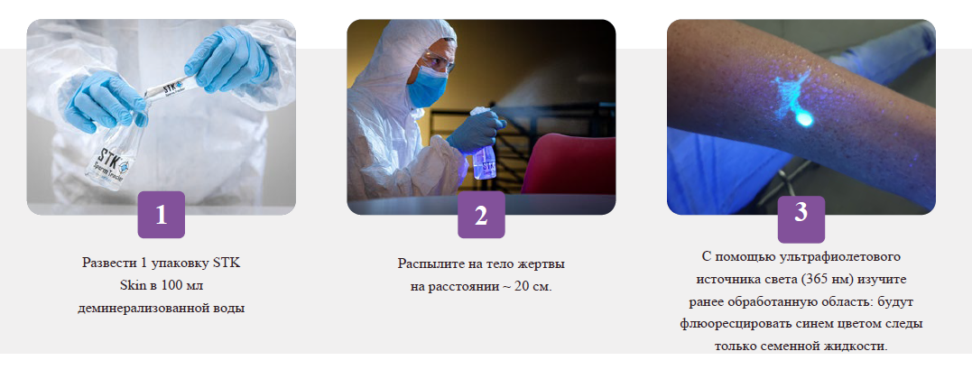 Когда совершается преступление насильственного характера, экспертам на месте происшествия необходимо обязательно найти семенную жидкость насильника. Все транспортируемые объекты, собранные на месте происшествия, отправляются в лабораторию для анализа. К сожалению, в связи с недостаточным количеством имеющихся решений для выявления семенной жидкости, современный протокол по сбору семенной жидкости, в основном, базируется на проведении смывов, которые производятся практически в слепую. Для решения данной проблемы, AXO Science разработала STK Skin. Это спрей, который позволяет выявлять семенную жидкость на коже и волосах жертвы. Не токсичный, надежный и узкоспецифичный - STK Spray - незаменимое решение для экспертов.