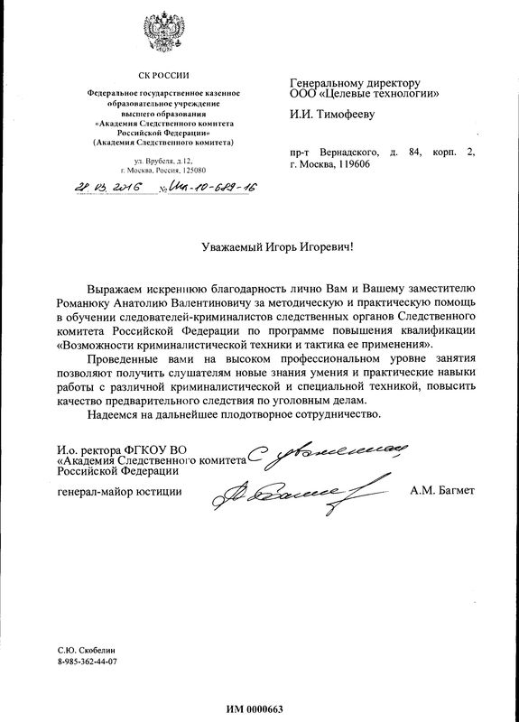 25 января 2016 года (г. Москва) - Руководство ЭКЦ МВД России объявило благодарность генеральному директору ООО "Целевые Технологии" Тимофееву И.И. за плодотворное сотрудничество в разработке новинок криминалистической техники и их оператичное внедрение в практическую деятельность органов внутренних дел, а также за существенный вклад в развитие и модернизацию научно-технической базы экспертно-криминалистических подразделений МВД России в 2015 году.